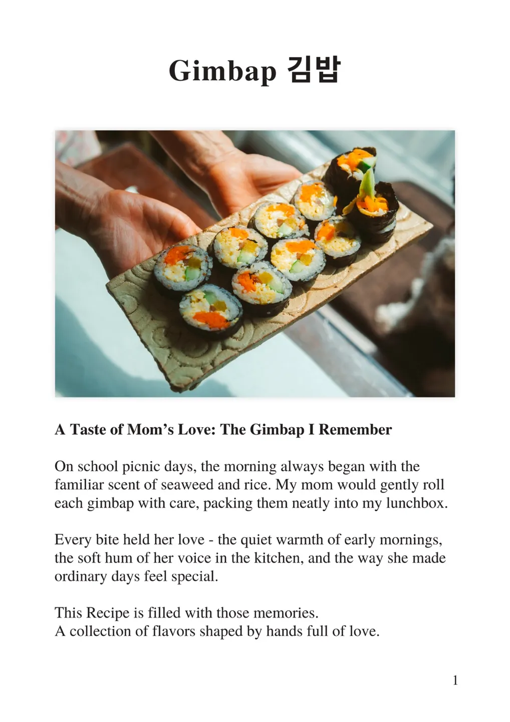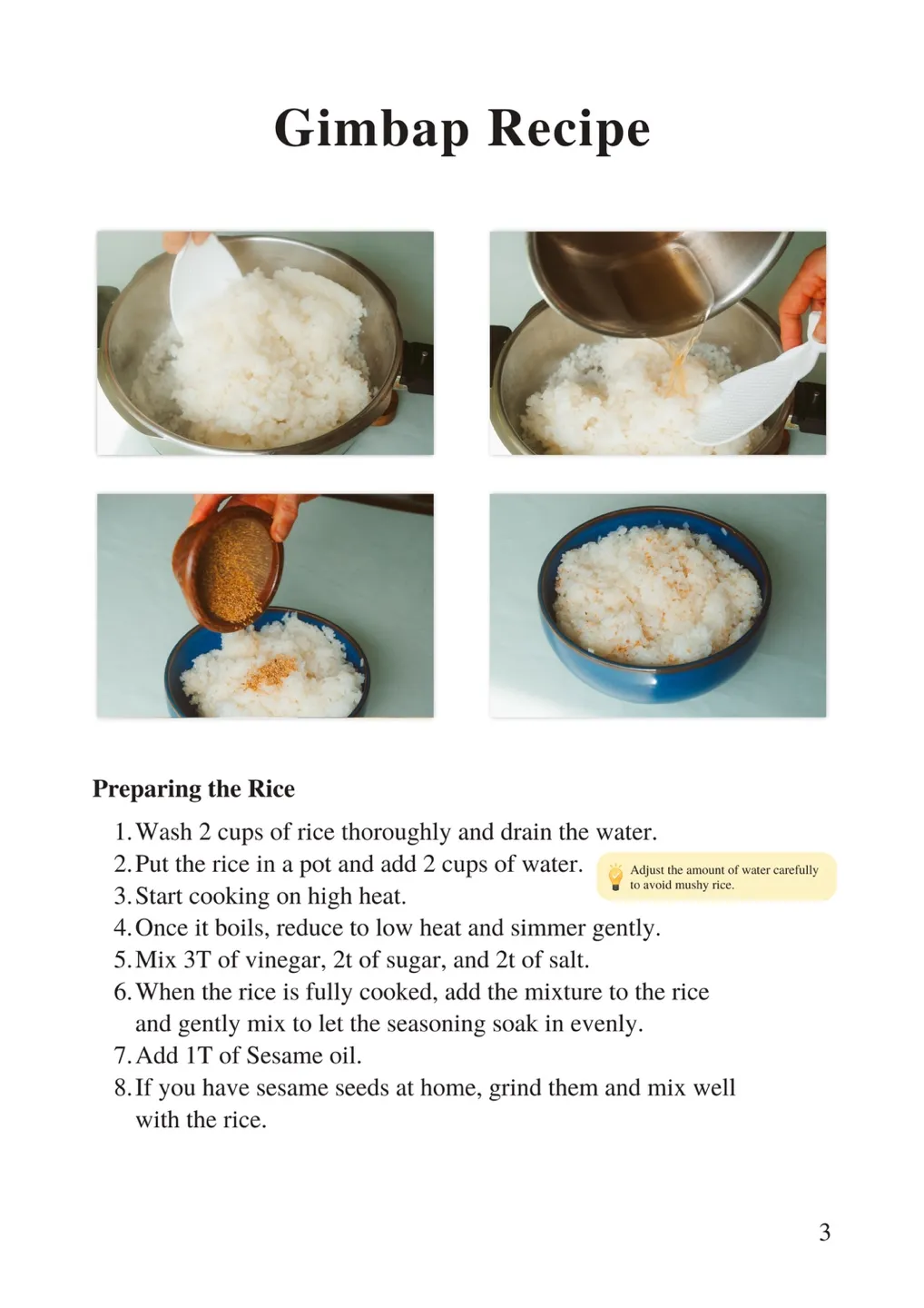 Please take a look at the Gimbap recipe in advance. Try to imagine the steps, the colors, and the taste—it’ll help you feel more prepared!